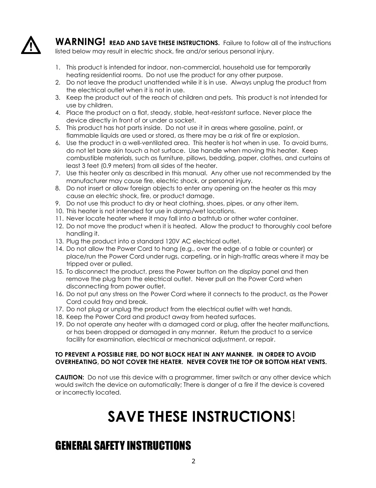 TO PREVENT A POSSIBLE FIRE, DO NOT BLOCK HEAT IN ANY MANNER. IN ORDER TO AVOID