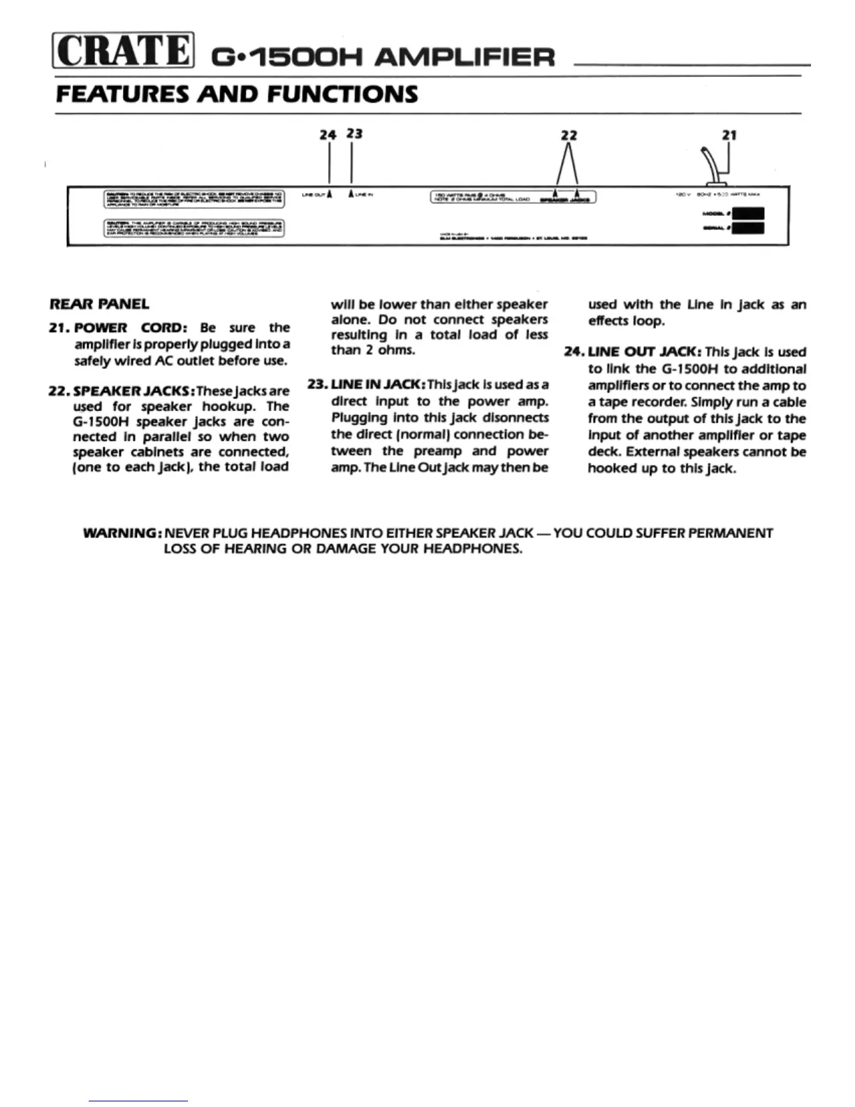 Crate Amplifier G1500 - Rear Panel Facilities