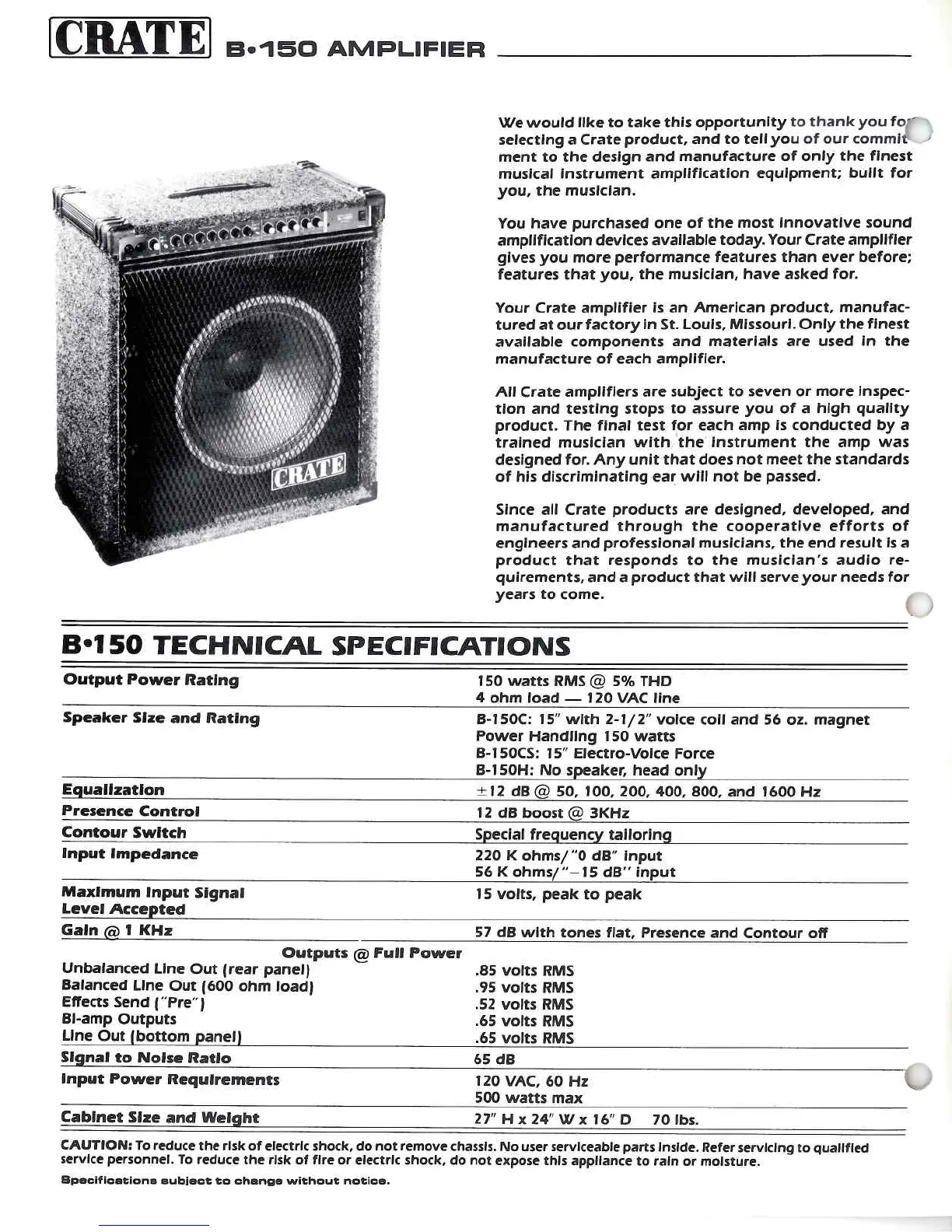 Crate B-150 - B-150 Technical Specifications; Output Power Rating; Speaker Size and Rating; Power Handling