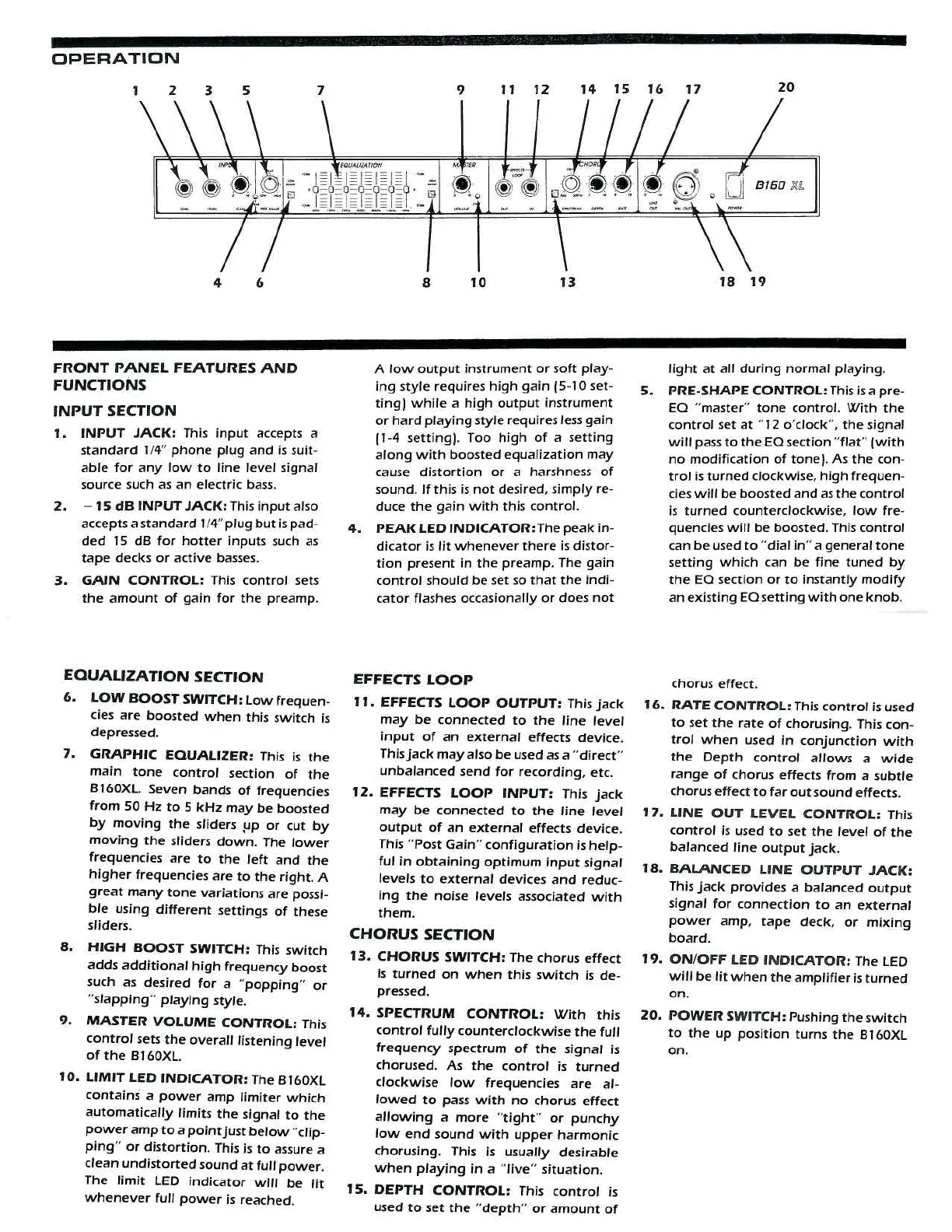 Crate B160XL - Front Panel Features and Functions; Input Section Controls; Equalization and Tone Controls; Effects Loop and Chorus Section