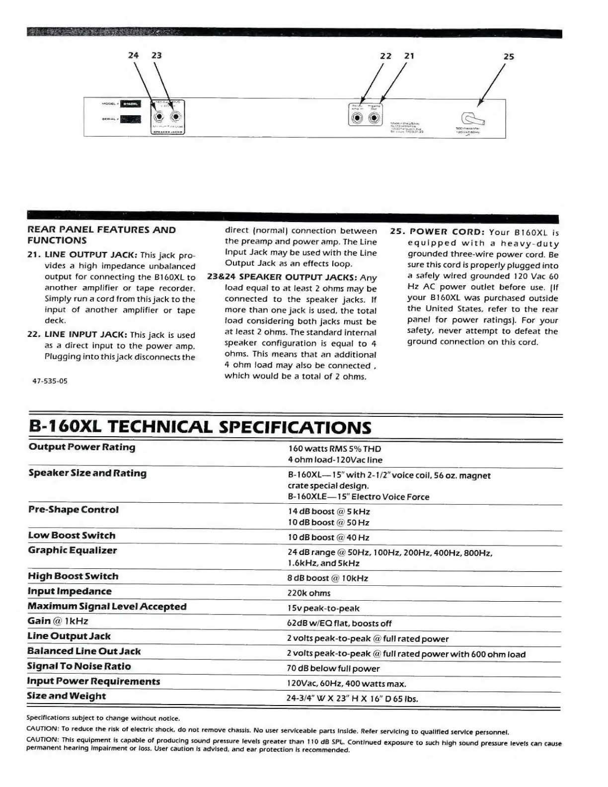 Crate B160XL - Rear Panel Features and Functions; Signal Output and Input Jacks; Power Connection and Safety; Crate B160 XL Technical Specifications