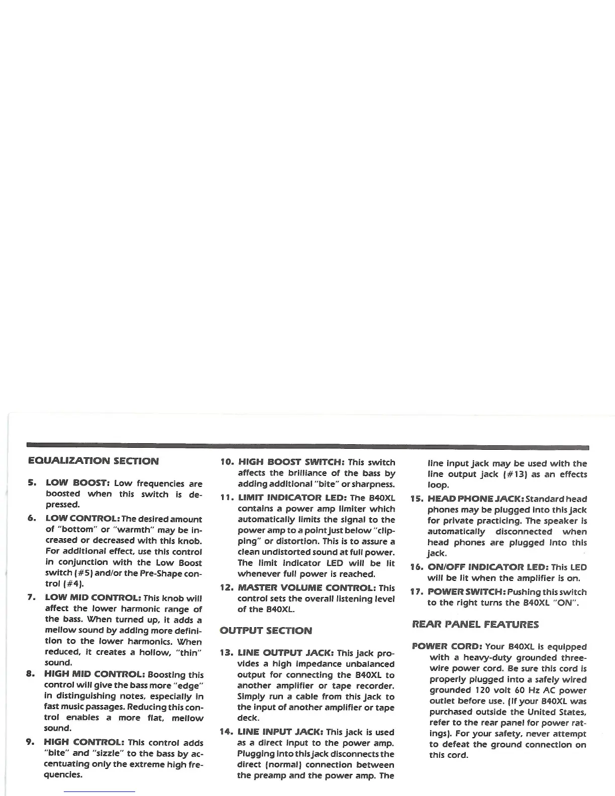 Crate B40XL - Equalizer Section; Output Section; Rear Panel Features; Low Boost