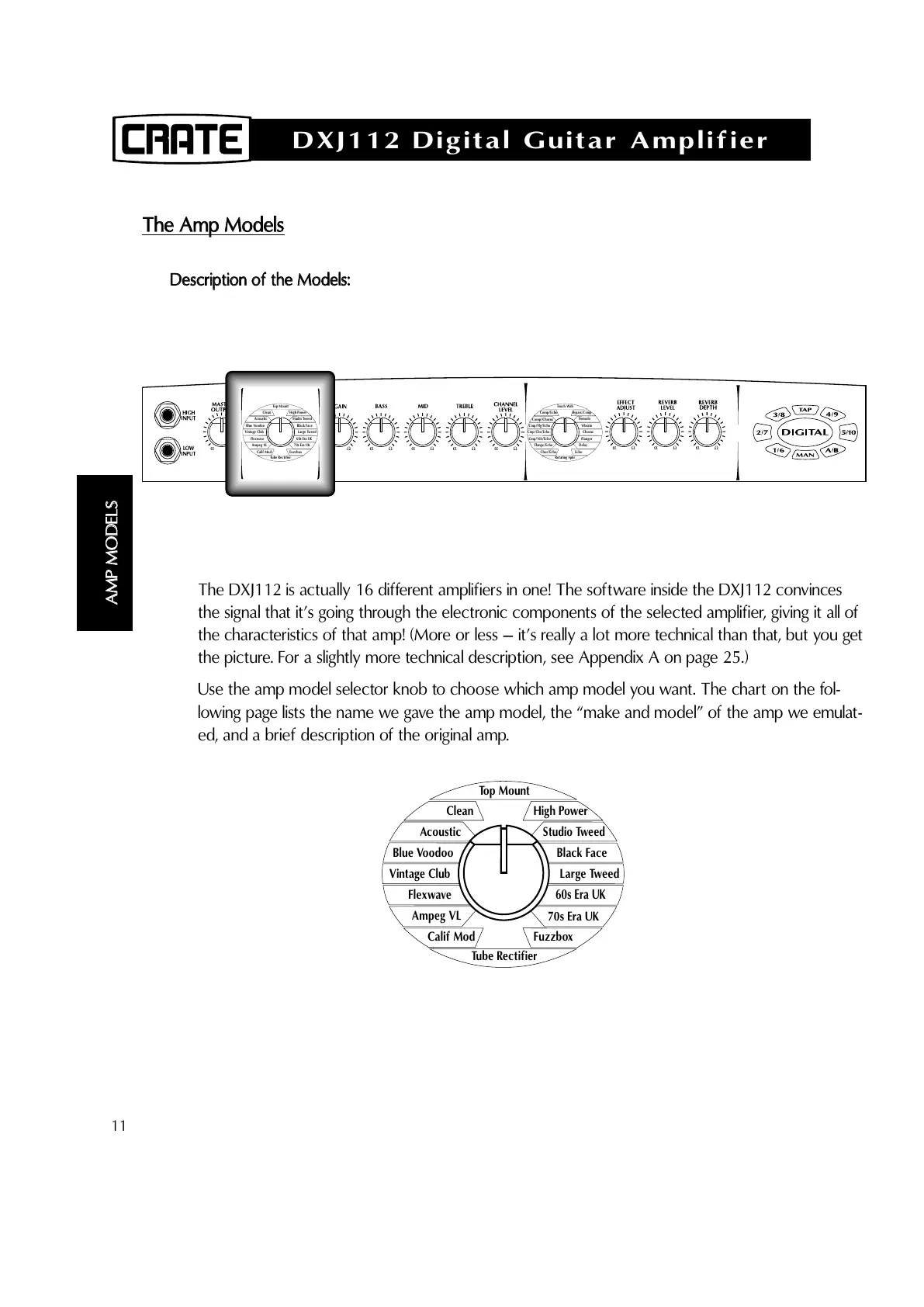 Use the amp model selector knob to choose which amp model you want. The chart on the fol-