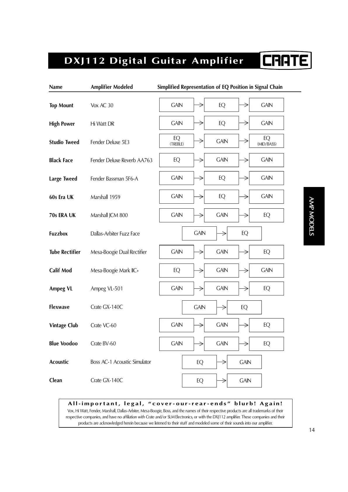 respective companies, and have no affiliation with Crate and/or SLM Electronics, or with the DXJ112 amplifier. These companies and their