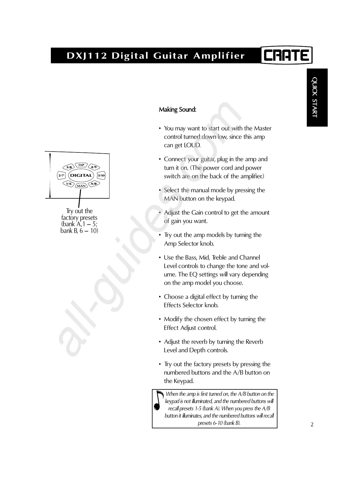 When the amp is first turned on, the A/B button on the