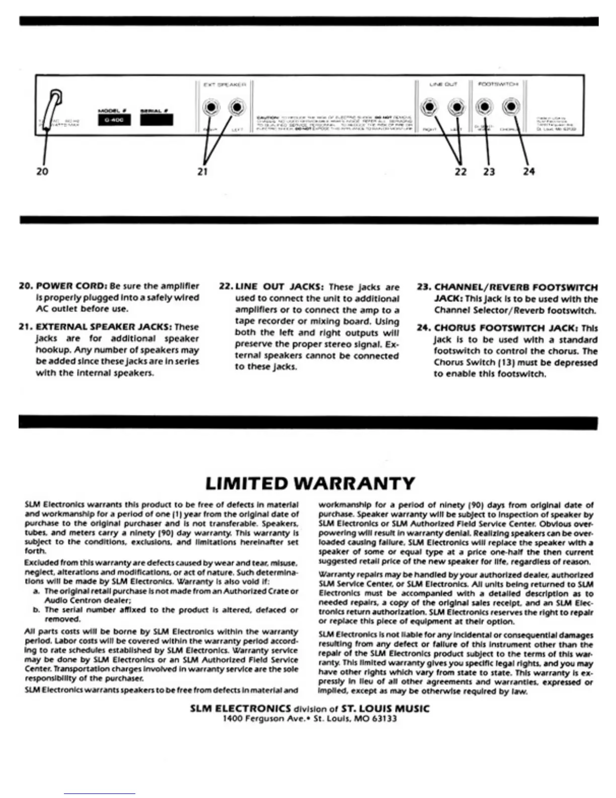 Crate G-40C - Rear Panel Connections and Features; Power and Speaker Connections; Footswitch Jacks; Limited Warranty Information