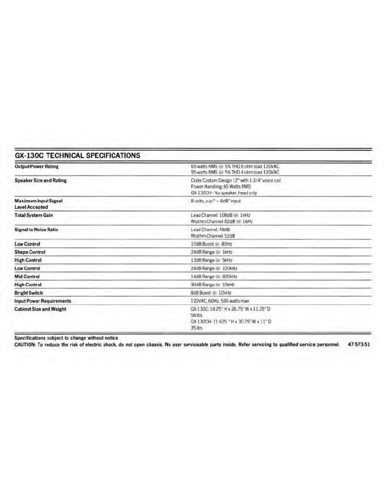 Crate GX-130C - Technical Specifications; Output Power Rating; Speaker and Power Handling; Input and Gain Specifications