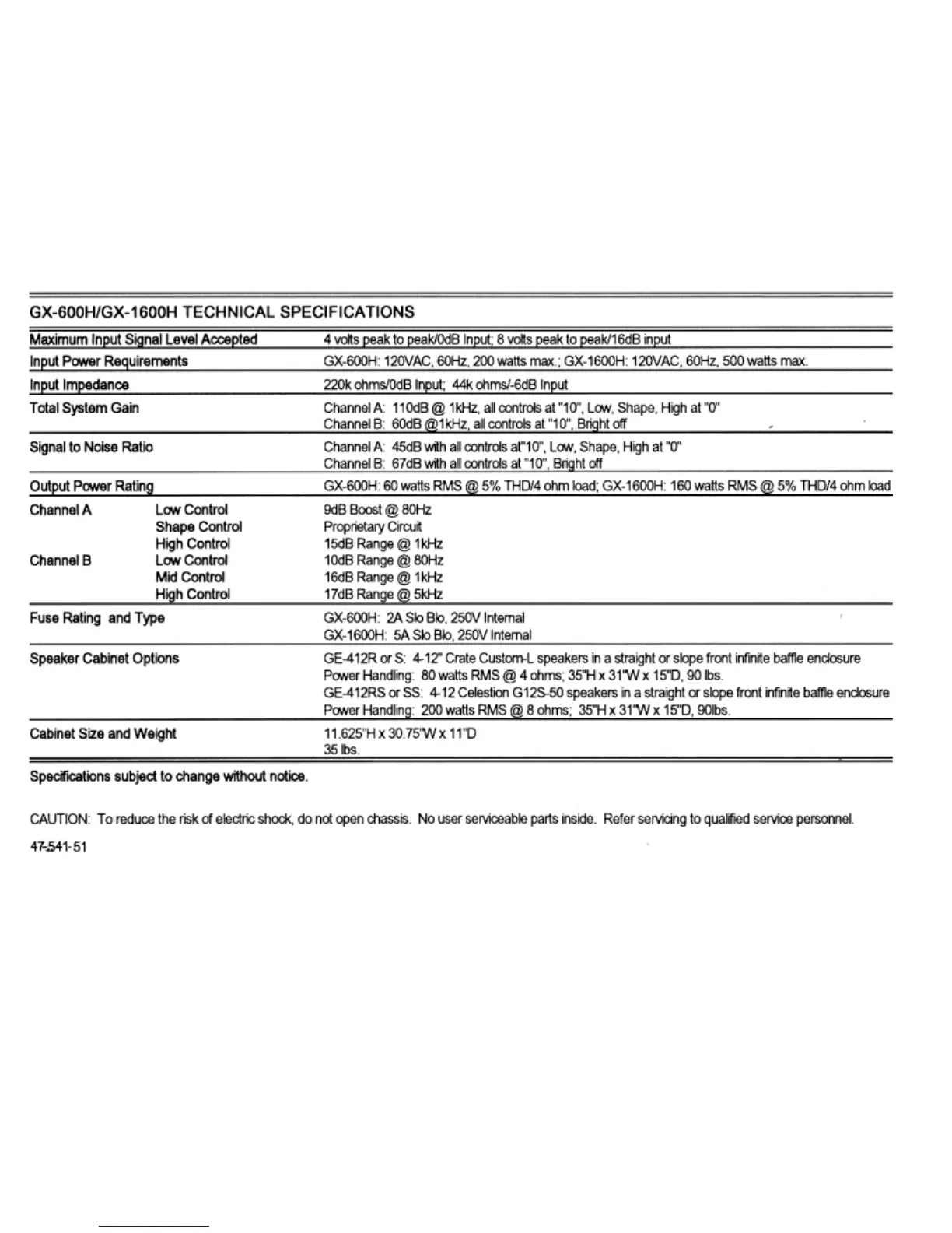 Crate GX-1600 - Technical Specifications; Signal and Power Ratings; Gain and Noise Ratio; Output Power and Control Ranges