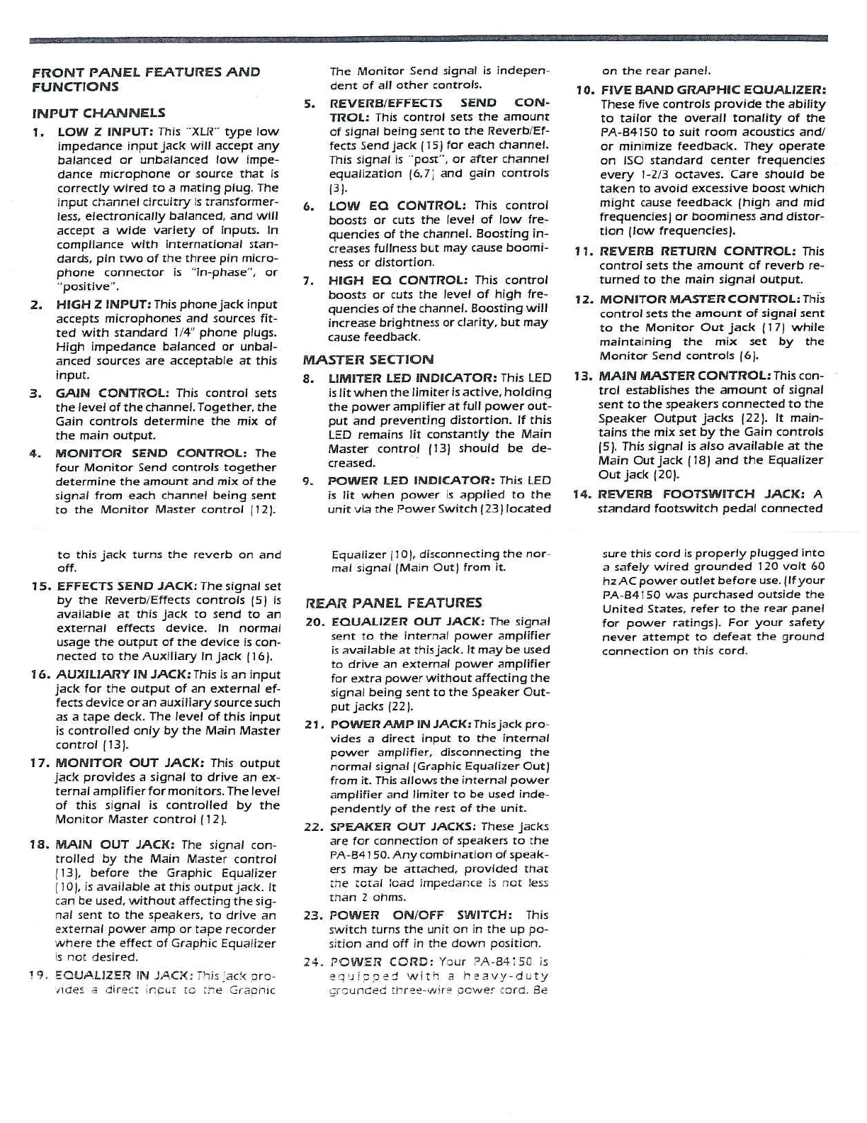 Crate PA-B4150 - Front Panel Features and Functions; Input Channel Controls; Reverb and Effects Controls; Master Section Controls