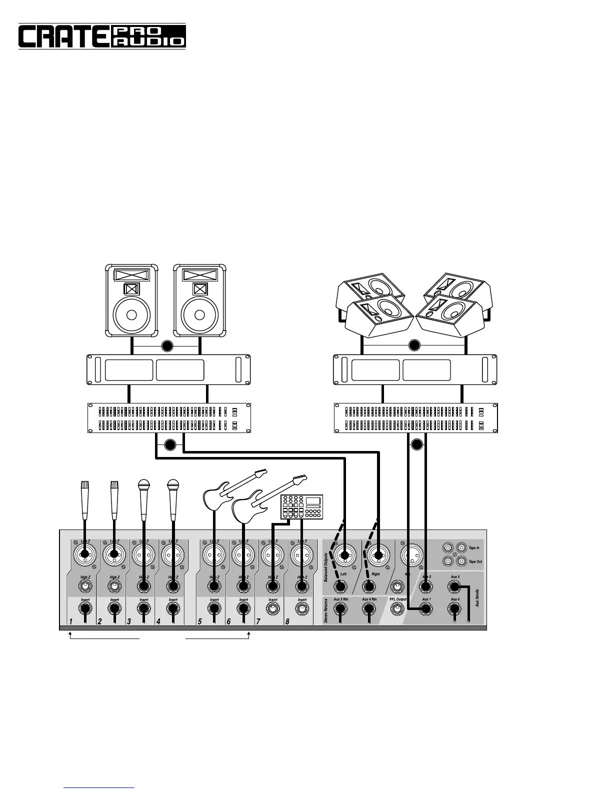 the Aux 1 and Aux 2 controls (#9, page 4) to adjust the mix of the signals sent to the monitors.