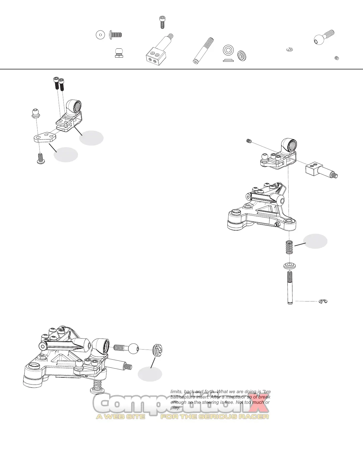 1 - Build up the left and right steering blocks as shown to the left. Start by threading the button head screw through
