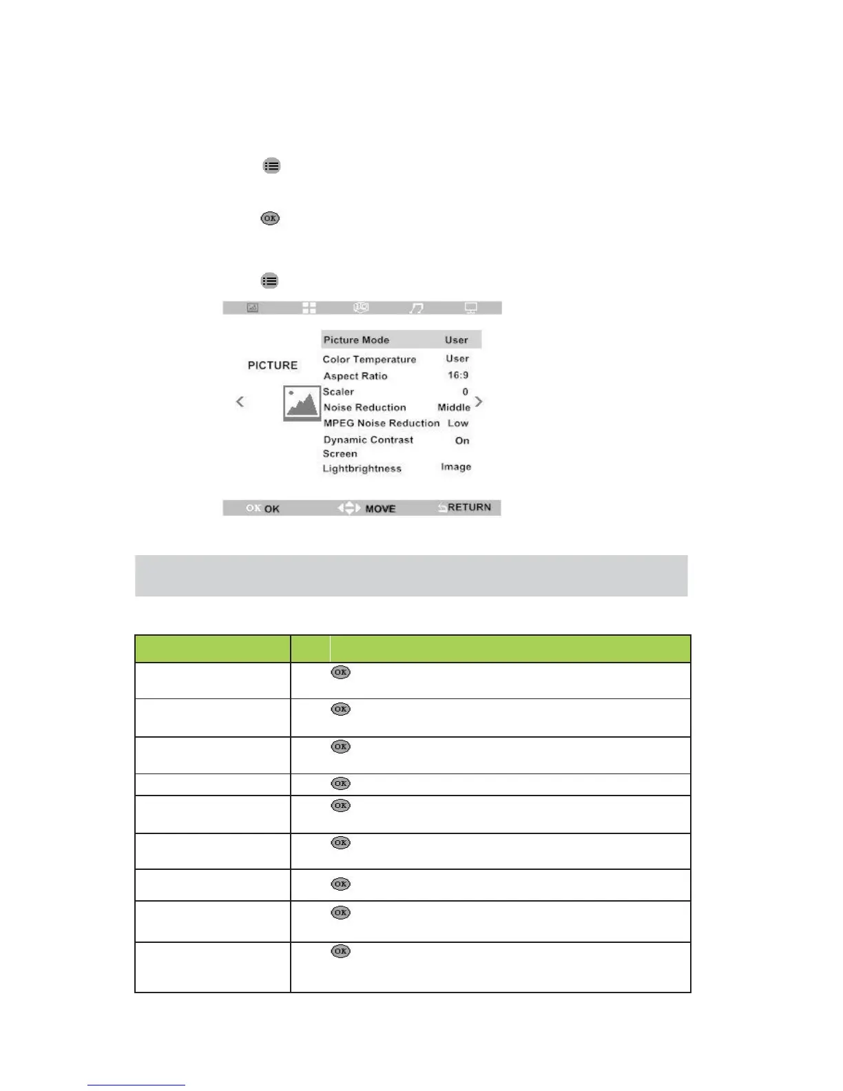 Note :Only menu “picture mode/color temperature” in User mode, inner parameter can