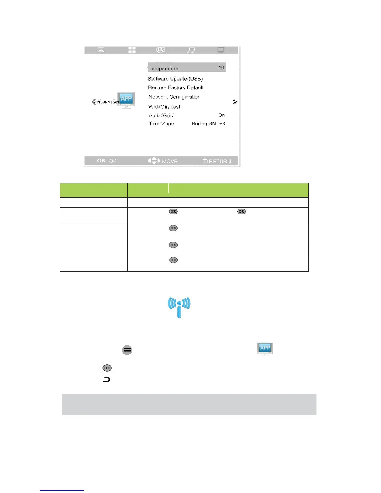 1. Press button ,then press ◄ and ►, select “Application”