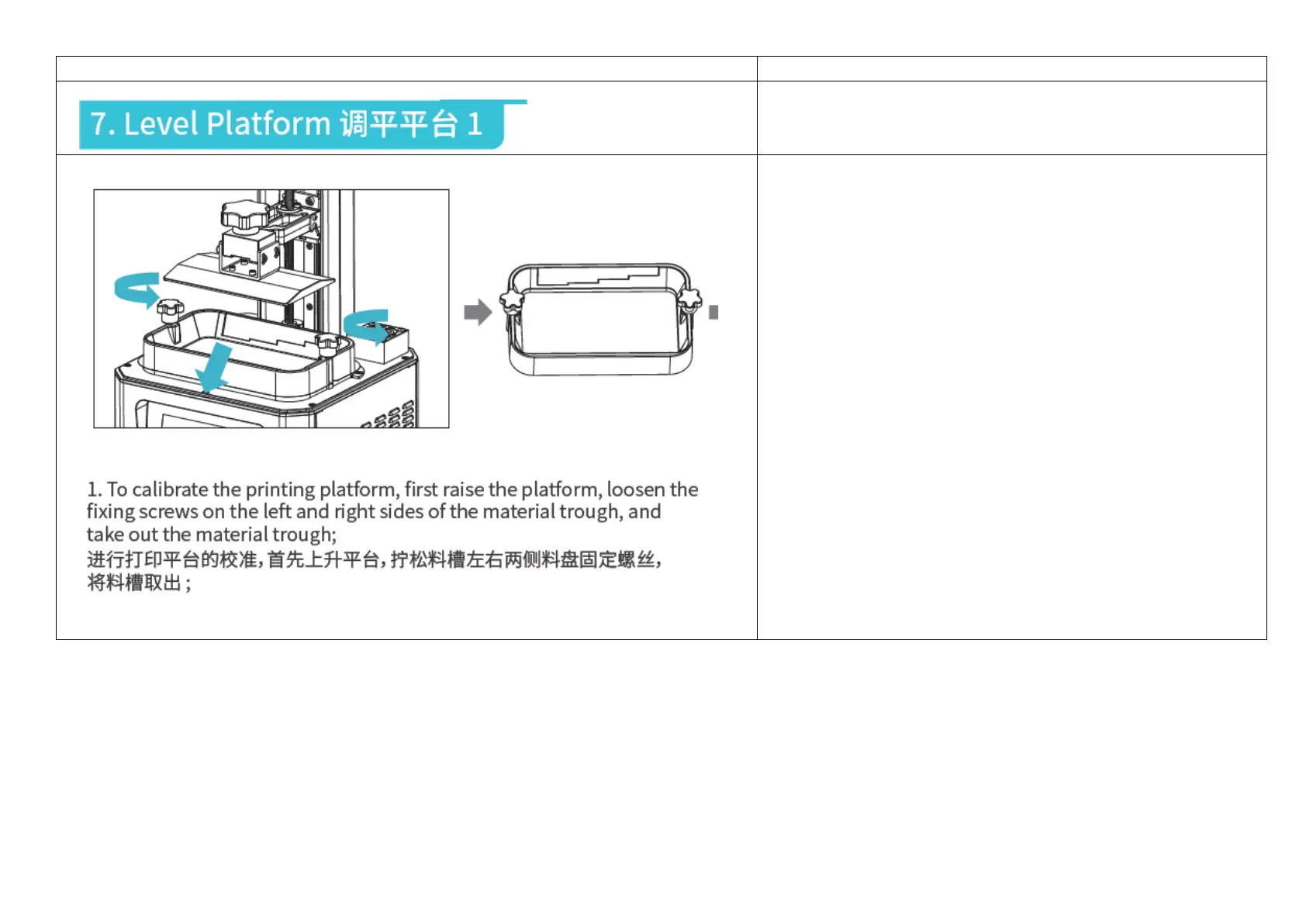 进行打印平台的校准,首先上升平台,拧松料槽左右两侧料