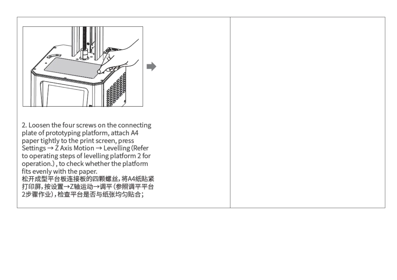 松开成型平台板连接板的四颗螺丝,将A4纸贴紧打印屏,按