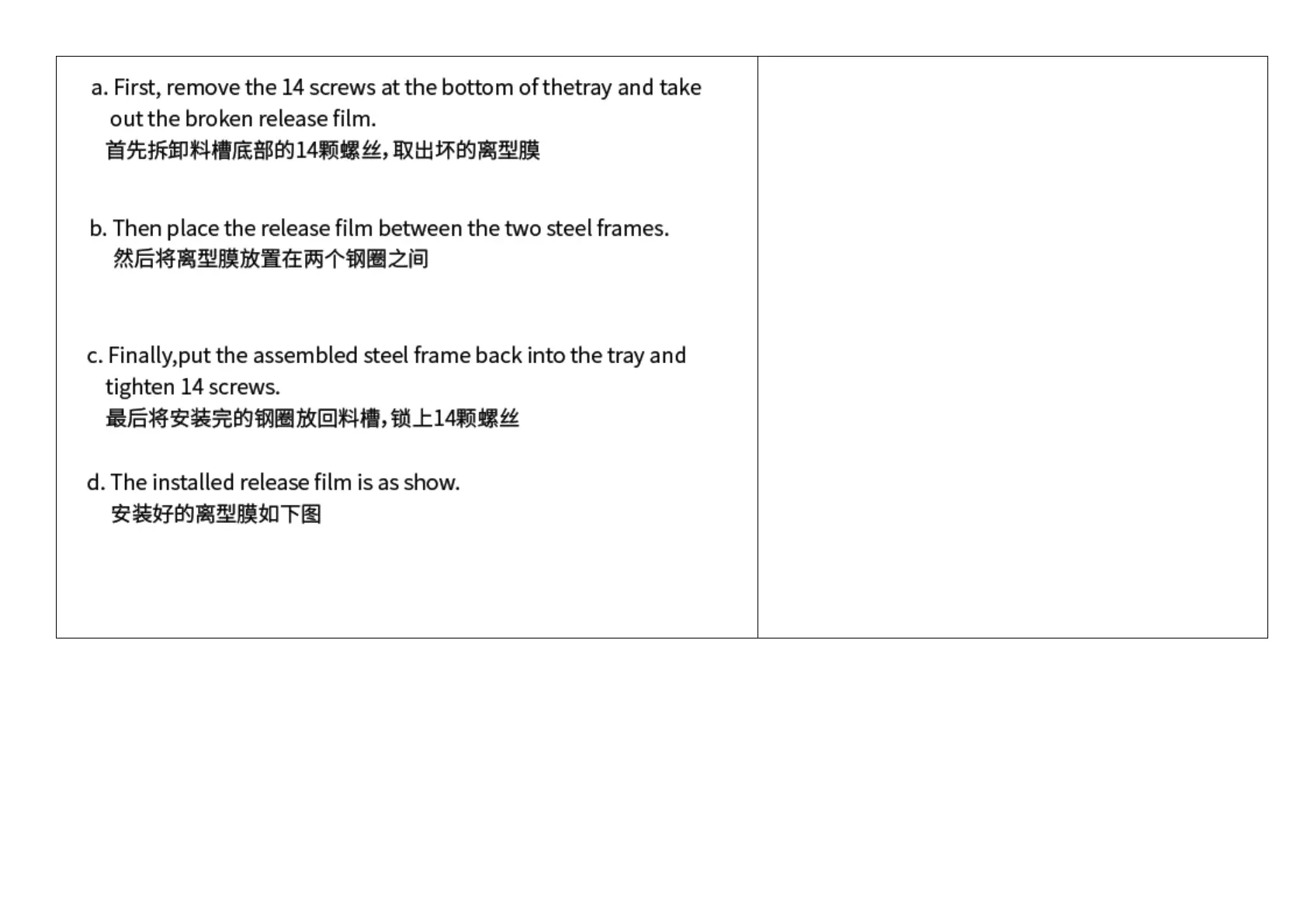 首先拆卸料槽底部的14颗螺丝,取出坏的离型膜