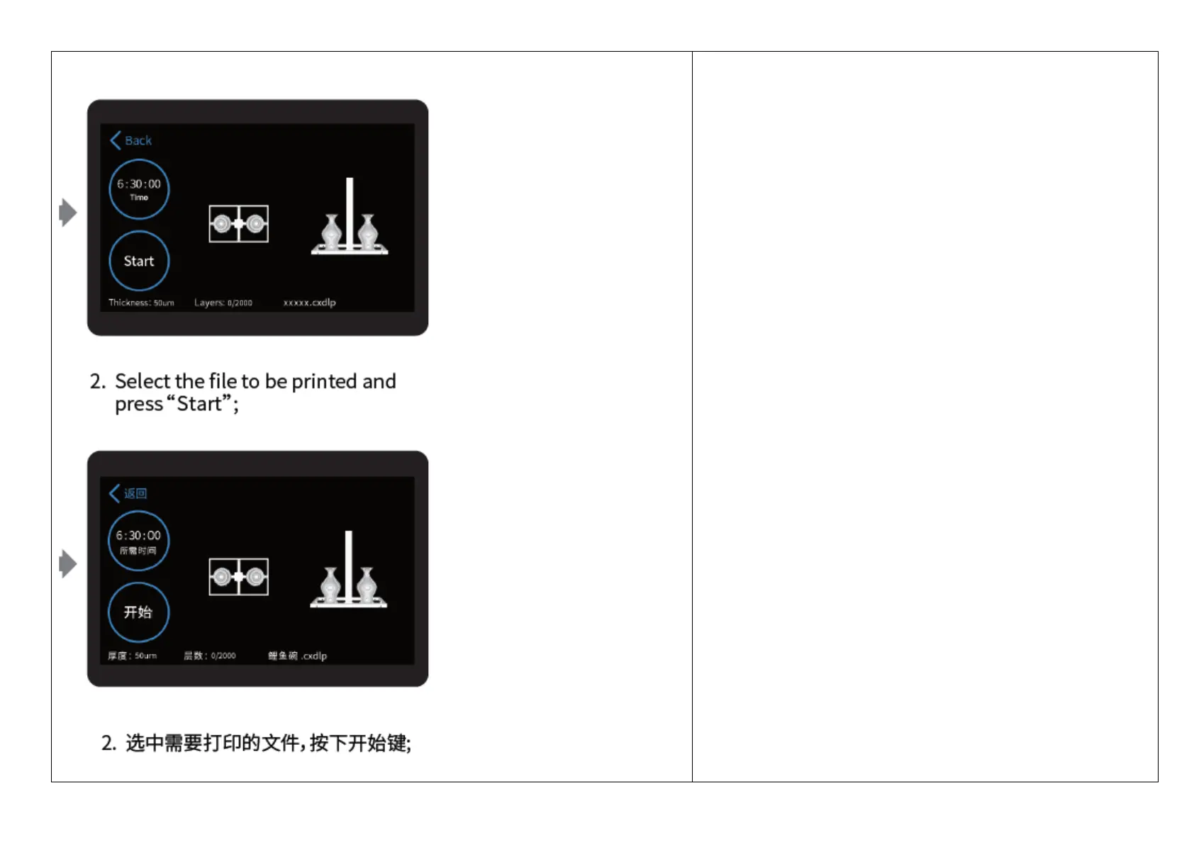 2. Select the file to be printed and press “Start”;