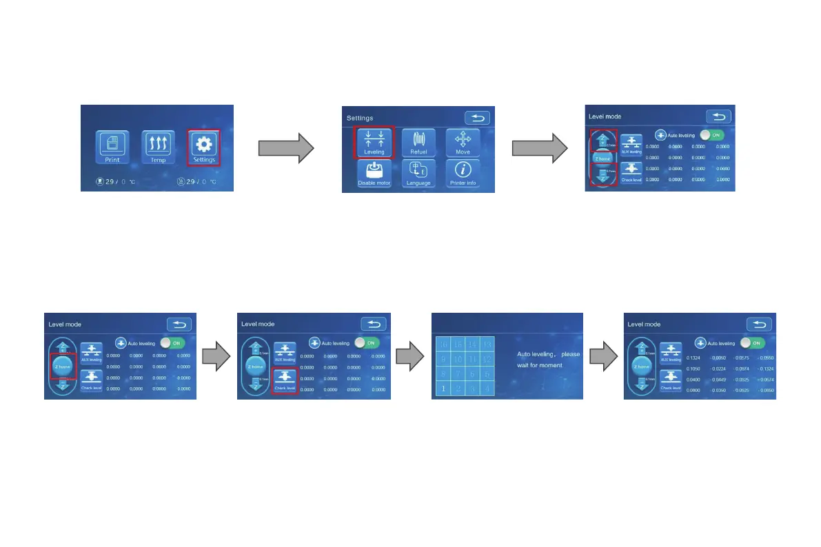 2. 2mm feeler gauge between the nozzle and the hot bed → If the gap is to o thin or too large, click "Z+" or "Z-" on