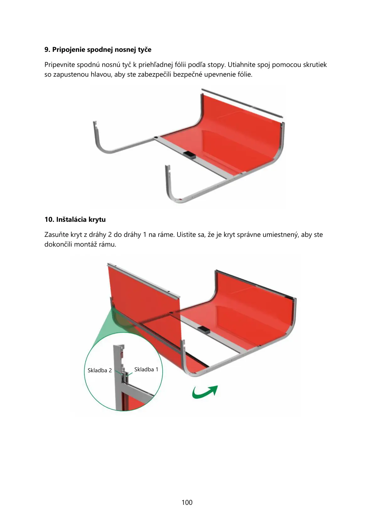 Pripevnite spodnú nosnú tyč k priehľadnej fólii poa stopy. Utiahnite spoj pomocou skrutiek