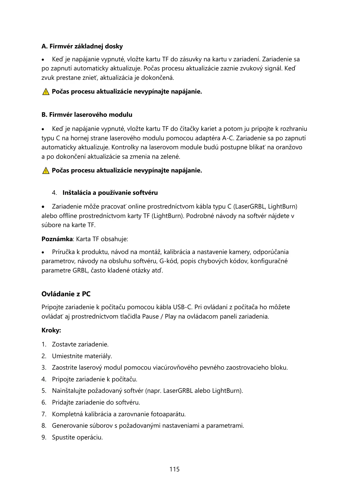 alebo offline prostredníctvom karty TF (LightBurn). Podrobné návody na softvér nájdete v