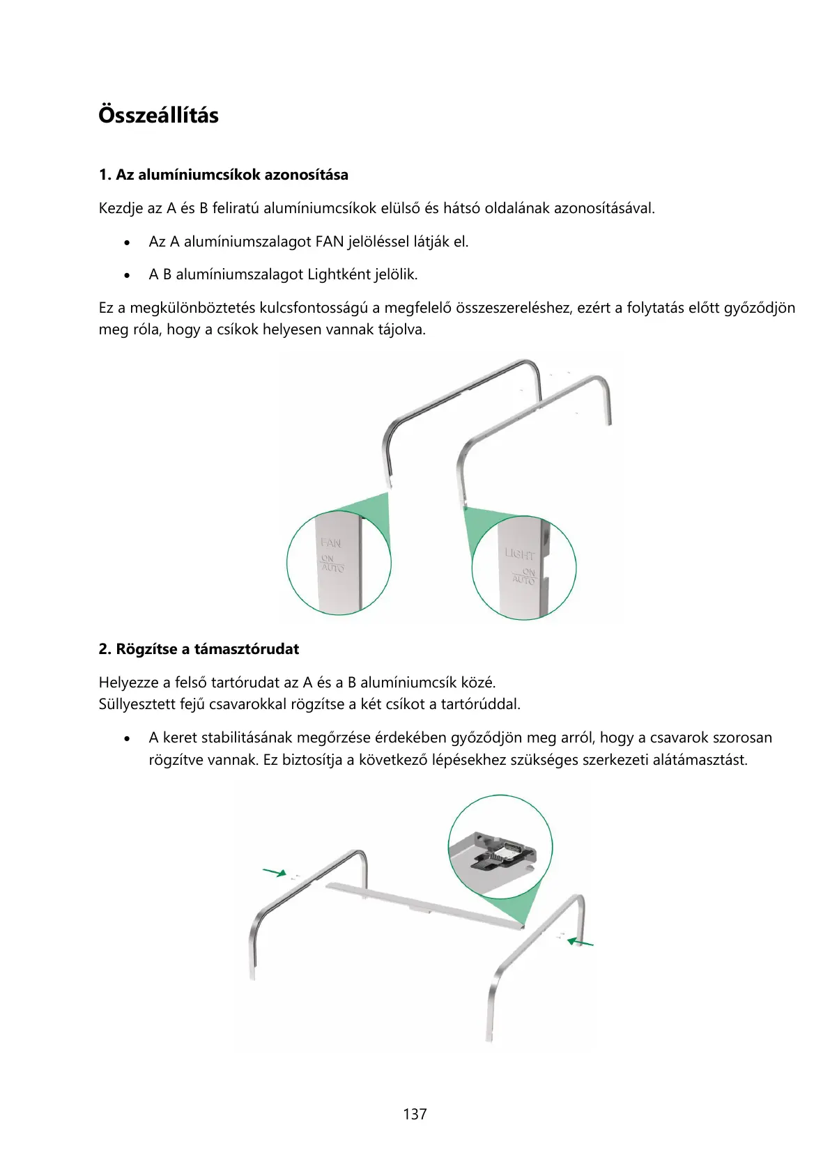 Helyezze a felső tartórudat az A és a B alumíniumcsík közé.
