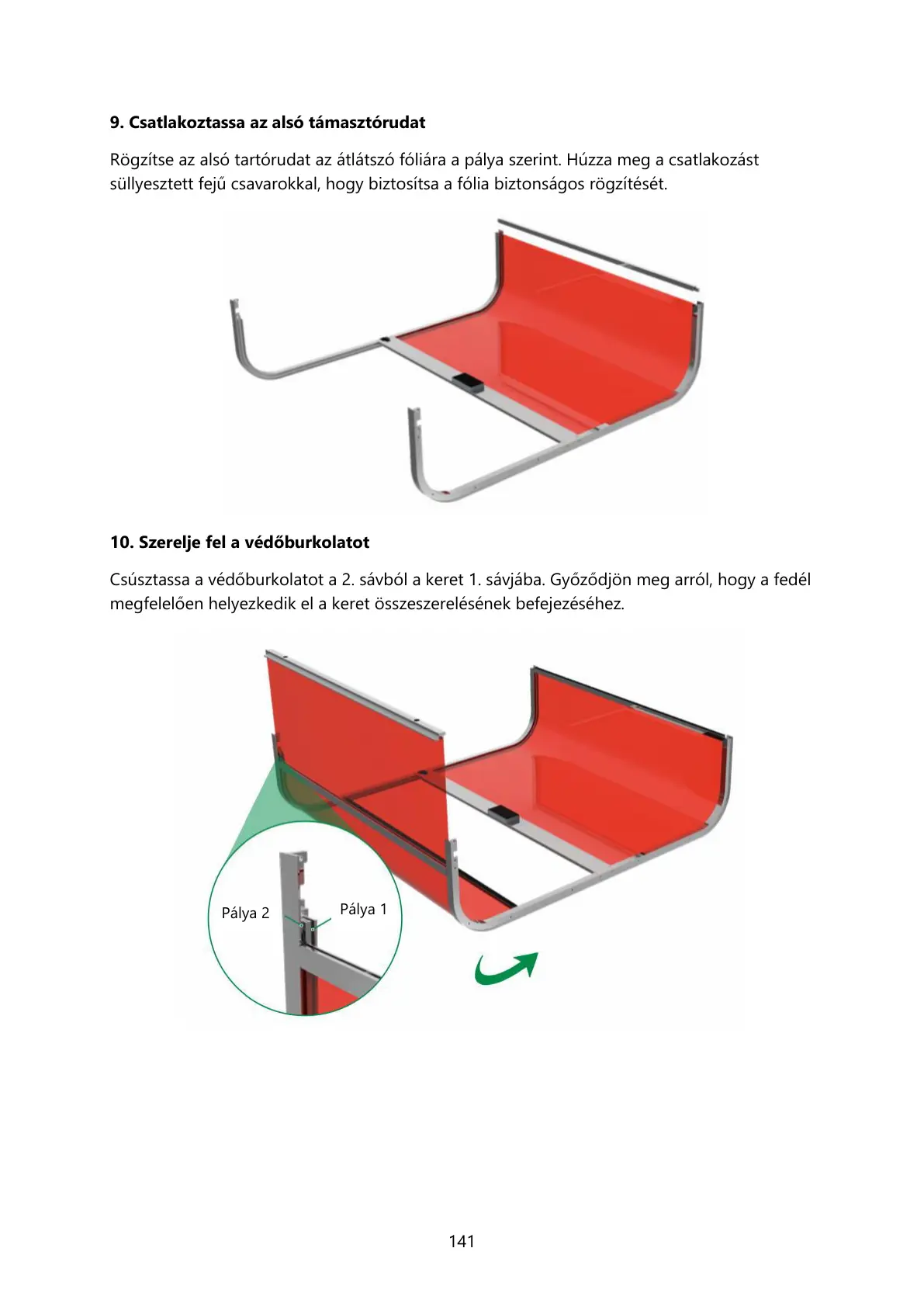 Rögzítse az alsó tartórudat az átlátszó fóliára a pálya szerint. Húzza meg a csatlakozást