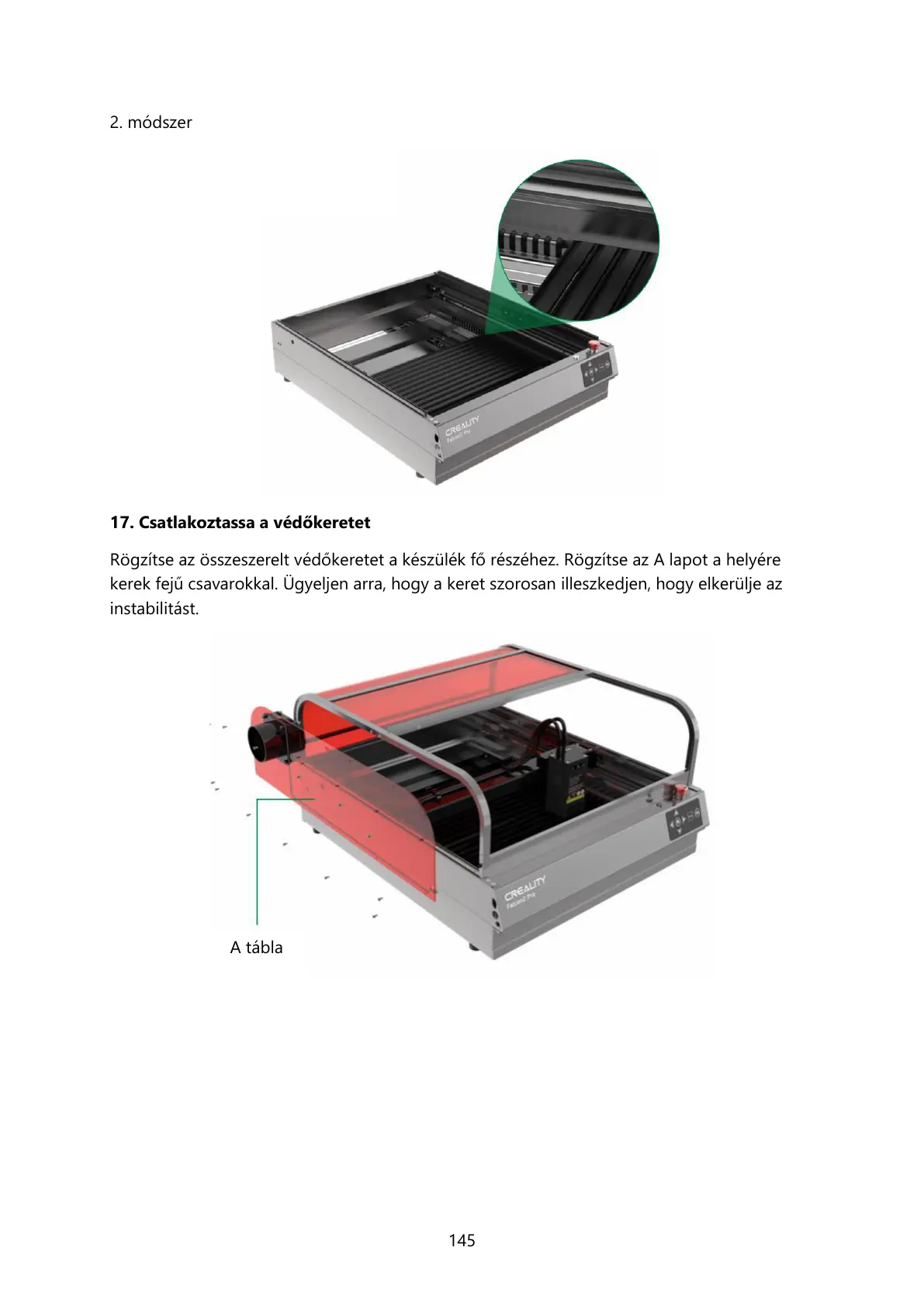 Rögzítse az összeszerelt védőkeretet a készülék fő részéhez. Rögzítse az A lapot a helyére