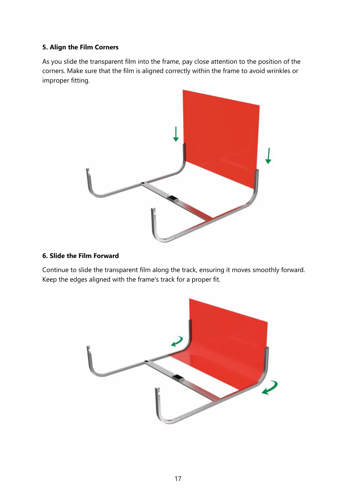 corners. Make sure that the film is aligned correctly within the frame to avoid wrinkles or