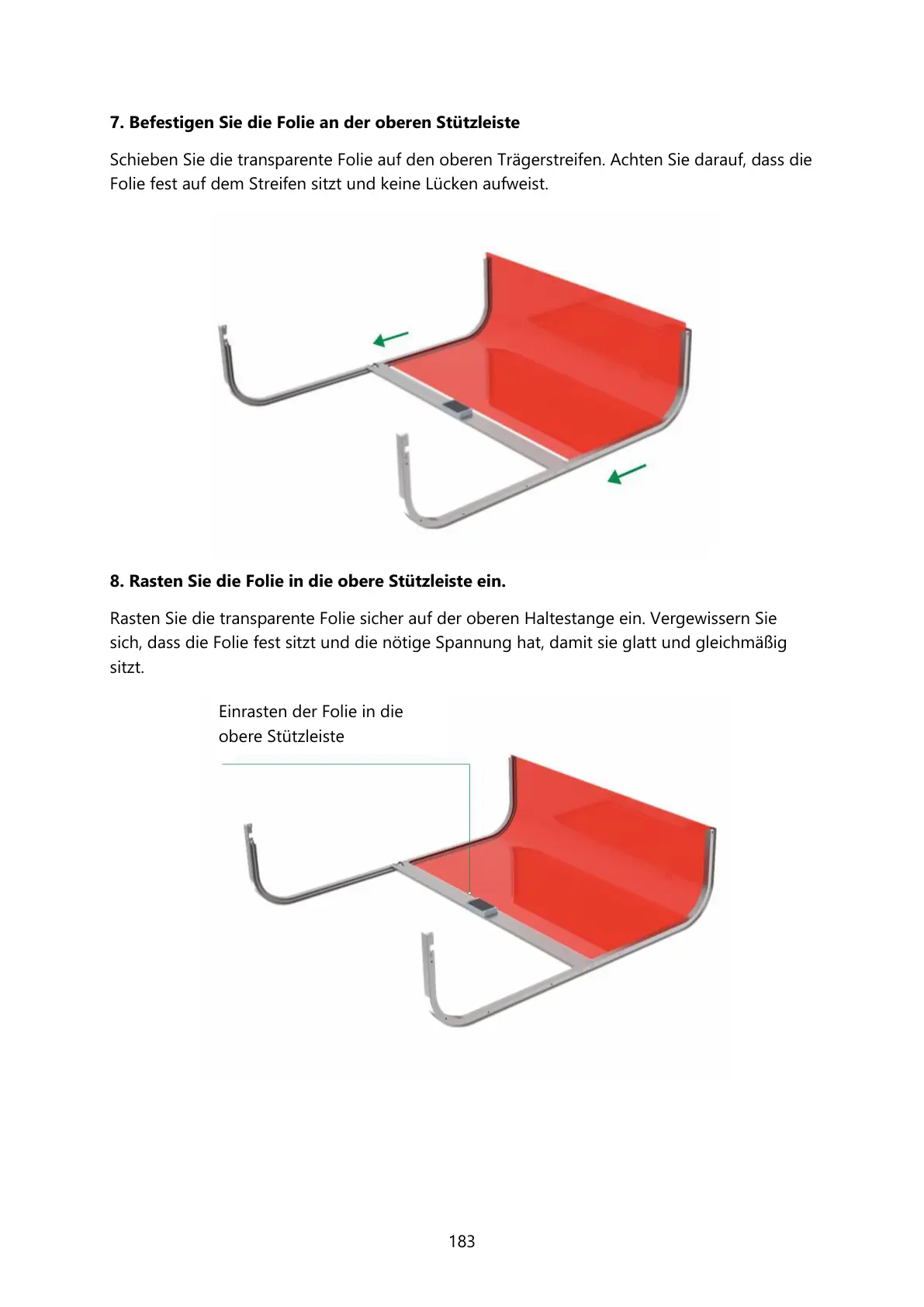 7. Befestigen Sie die Folie an der oberen Stützleiste