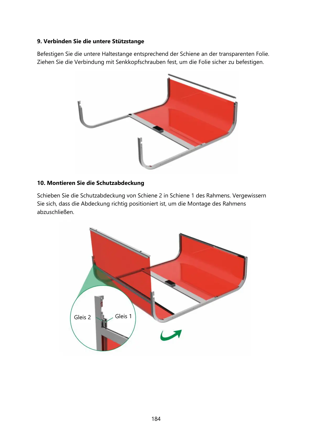 Schieben Sie die Schutzabdeckung von Schiene 2 in Schiene 1 des Rahmens. Vergewissern