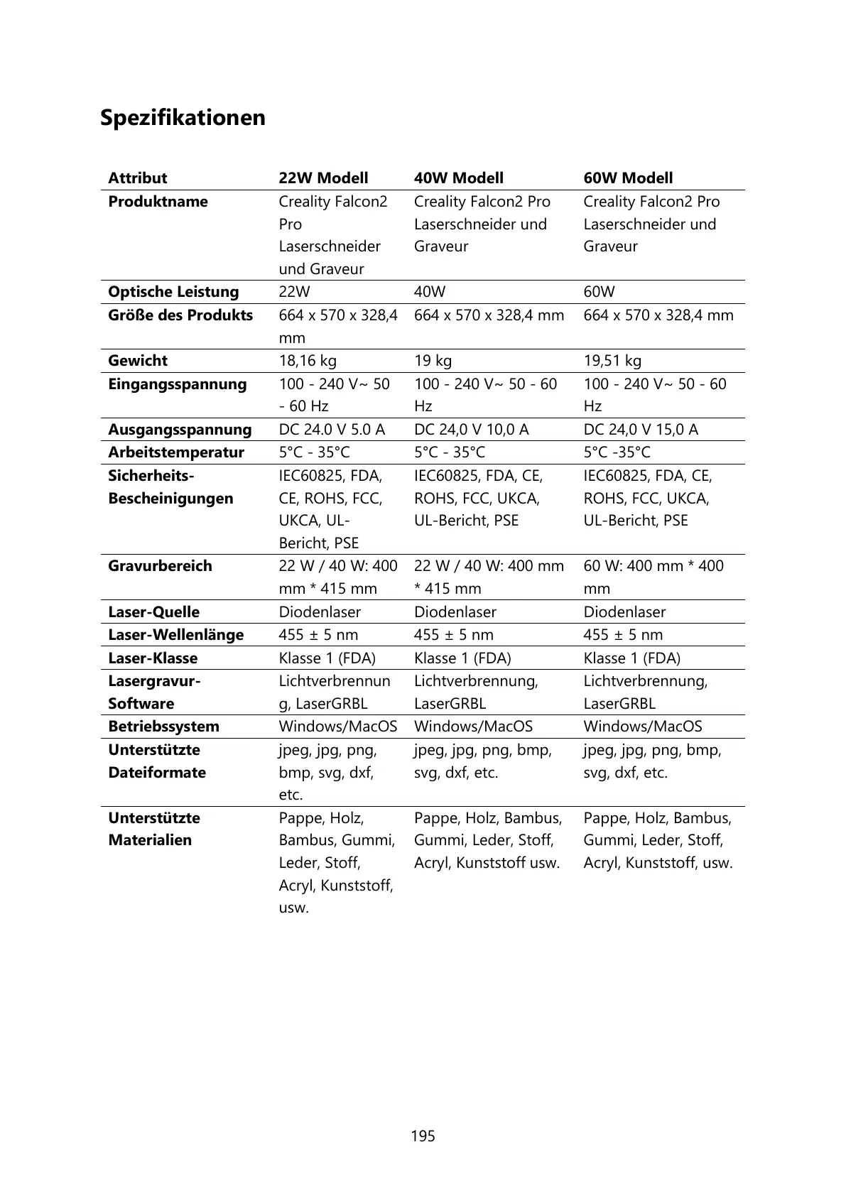 Creality Falcon2 Pro - Spezifikationen