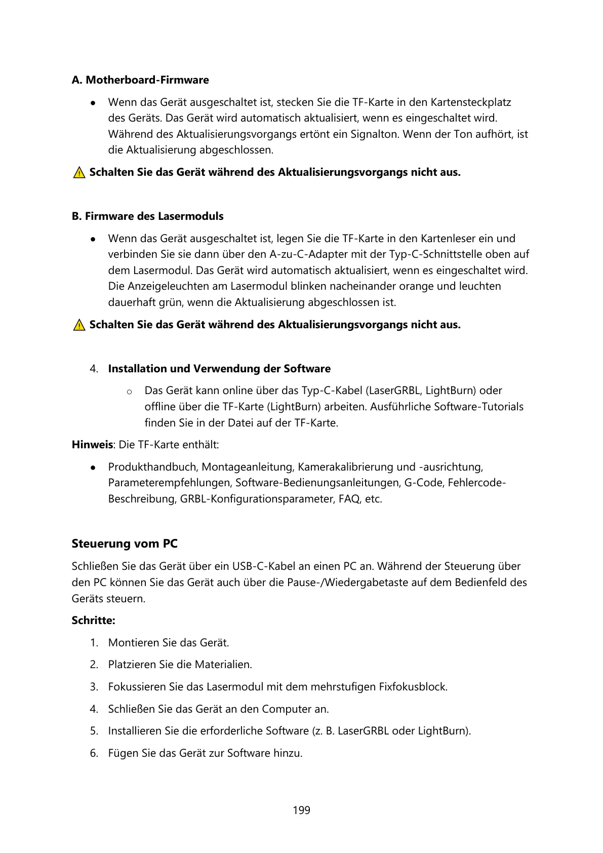 o Das Gerät kann online über das Typ-C-Kabel (LaserGRBL, LightBurn) oder