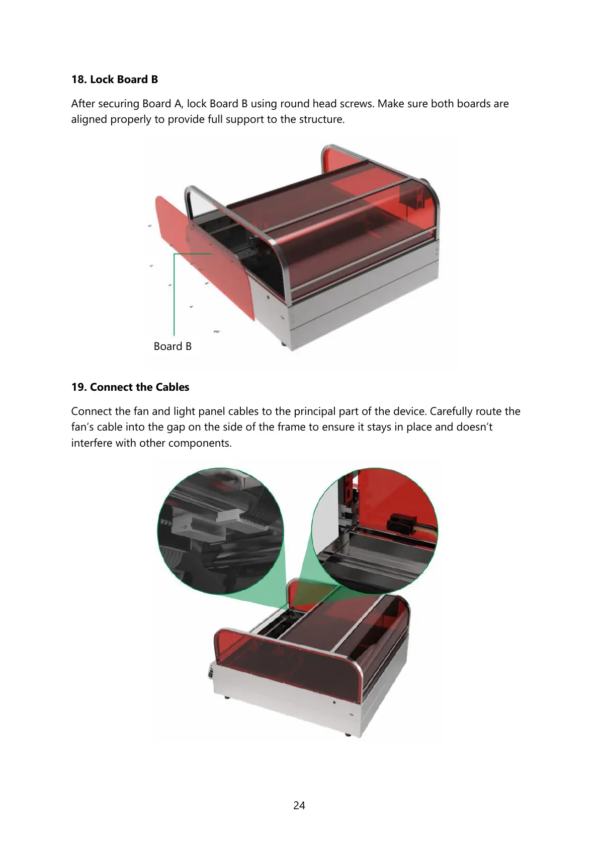 After securing Board A, lock Board B using round head screws. Make sure both boards are