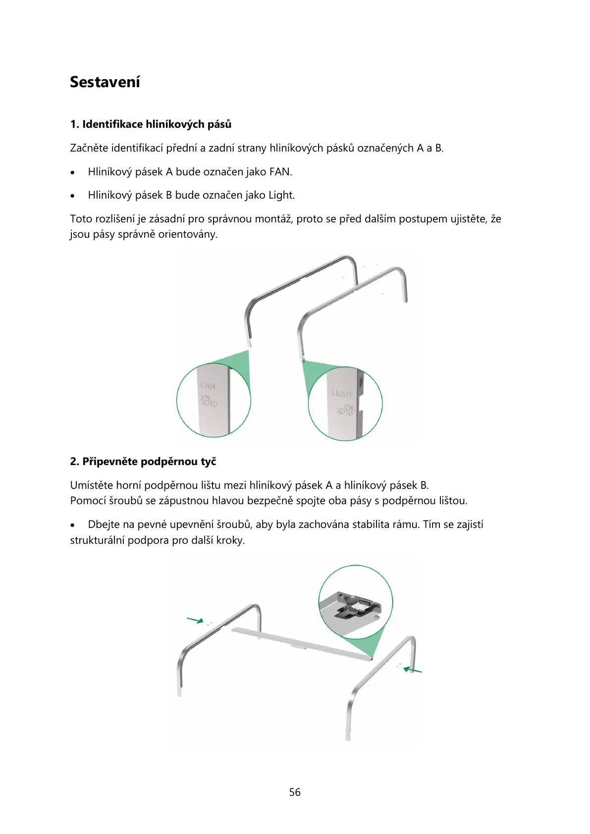 Umístěte horní podpěrnou lištu mezi hliníkový pásek A a hliníkový pásek B.