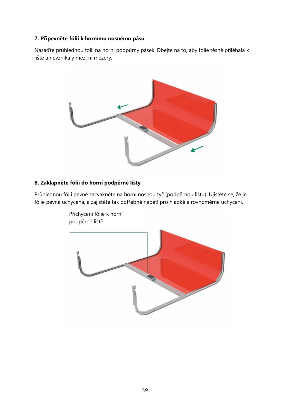 Průhlednou fólii pevně zacvakněte na horní nosnou tyč (podpěrnou lištu). Ujistěte se, že je