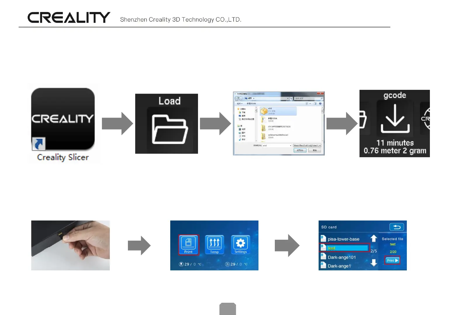 Open the softwareLoad → Select the file Wait for slicing to finish ,and save the Gcode file to TF card.