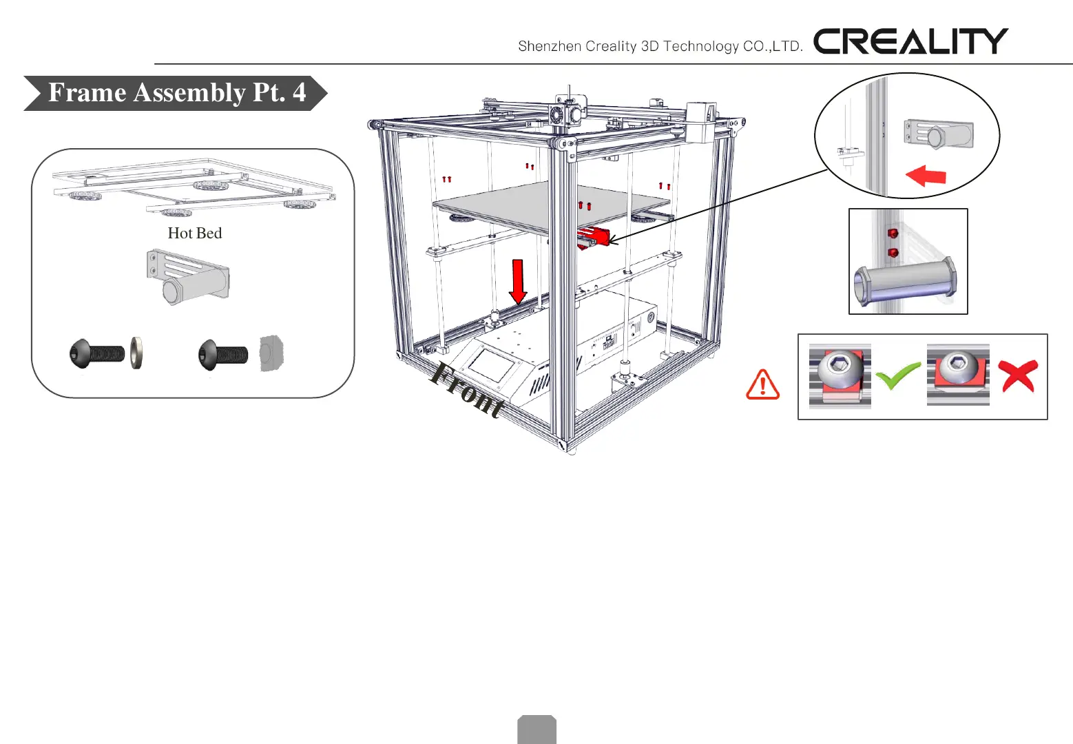 Step 1. Make sure the front of the base(b) is facing you. Place the hot bed on the support plate of the double Z-axis frame and align with the