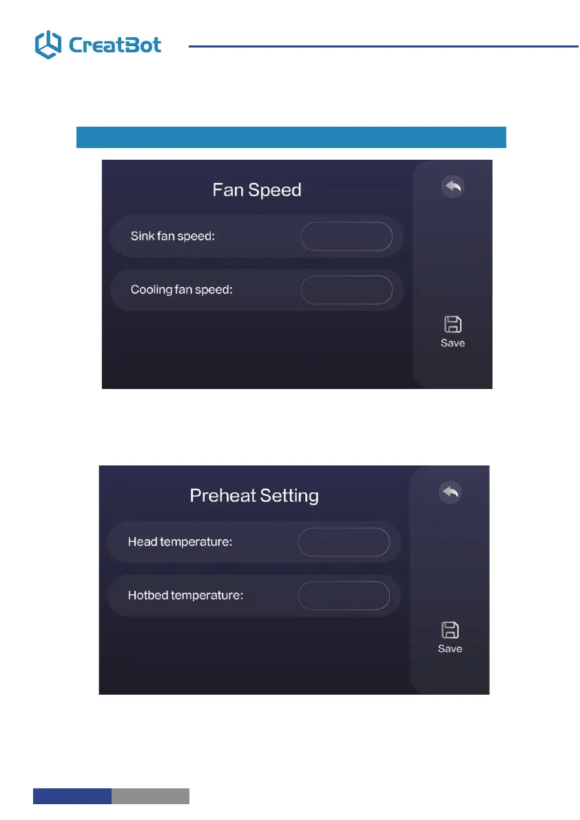 CreatBot D600 Pro 2 - Printer Operation: Fan and Preheat Settings; Fan Speed and Temperature Config