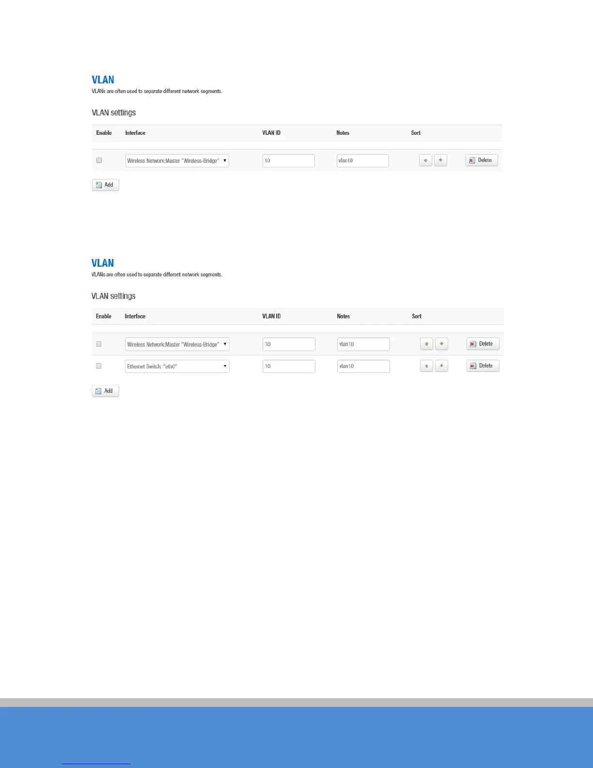 Bridge function is needed to use together with VLAN. As show below, we add VLAN 10