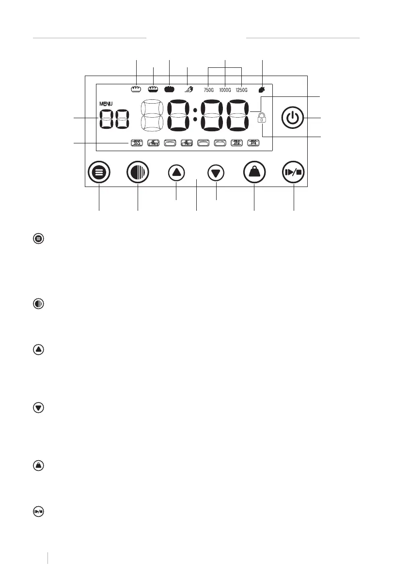 MENU: Met de menuknop navigeer je door het LCD-scherm tussen de 12 vooraf ingestel-