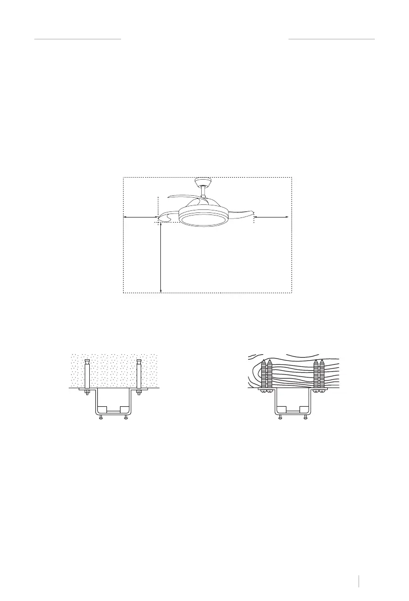 pendere la ventola consenta alle pale di trovarsi a 2,3 m o più da terra ea 76 cm dalla parete