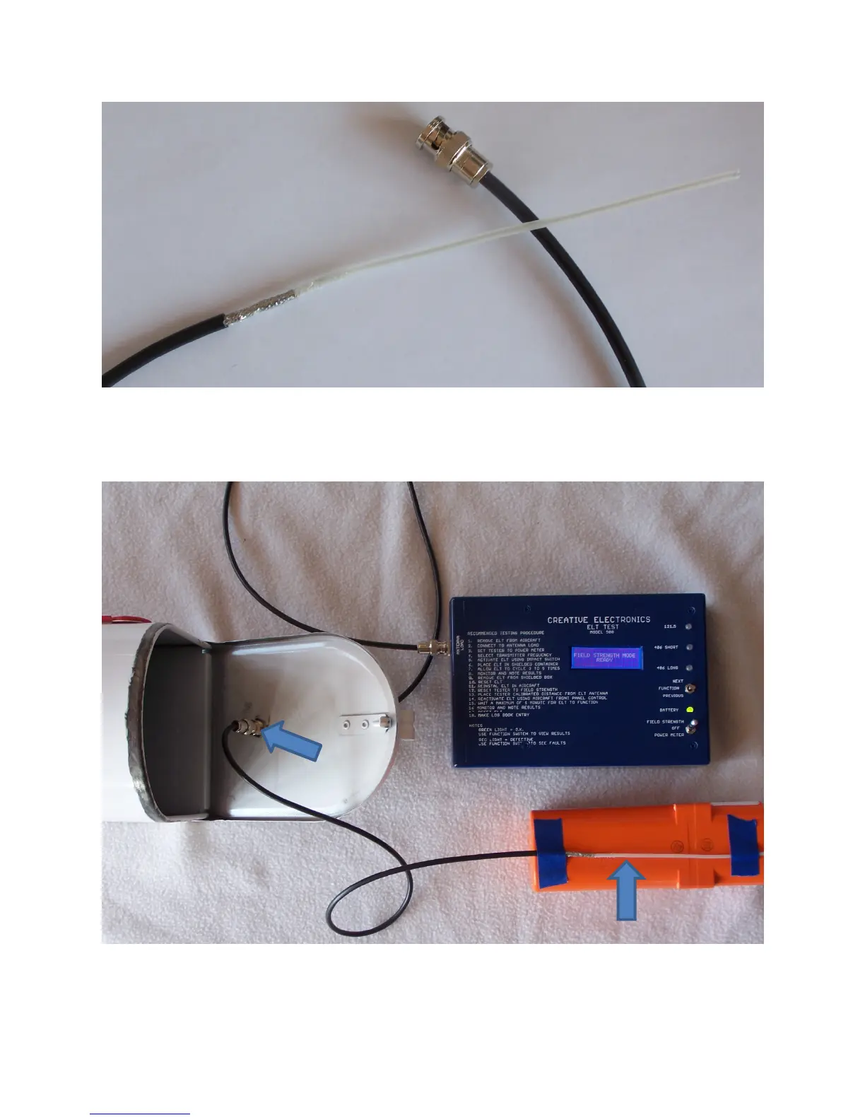 RF PICKUP CABLE SECURED TO ELT AND CONNECTED THRU BULKHEAD CONNECTOR TO TESTER