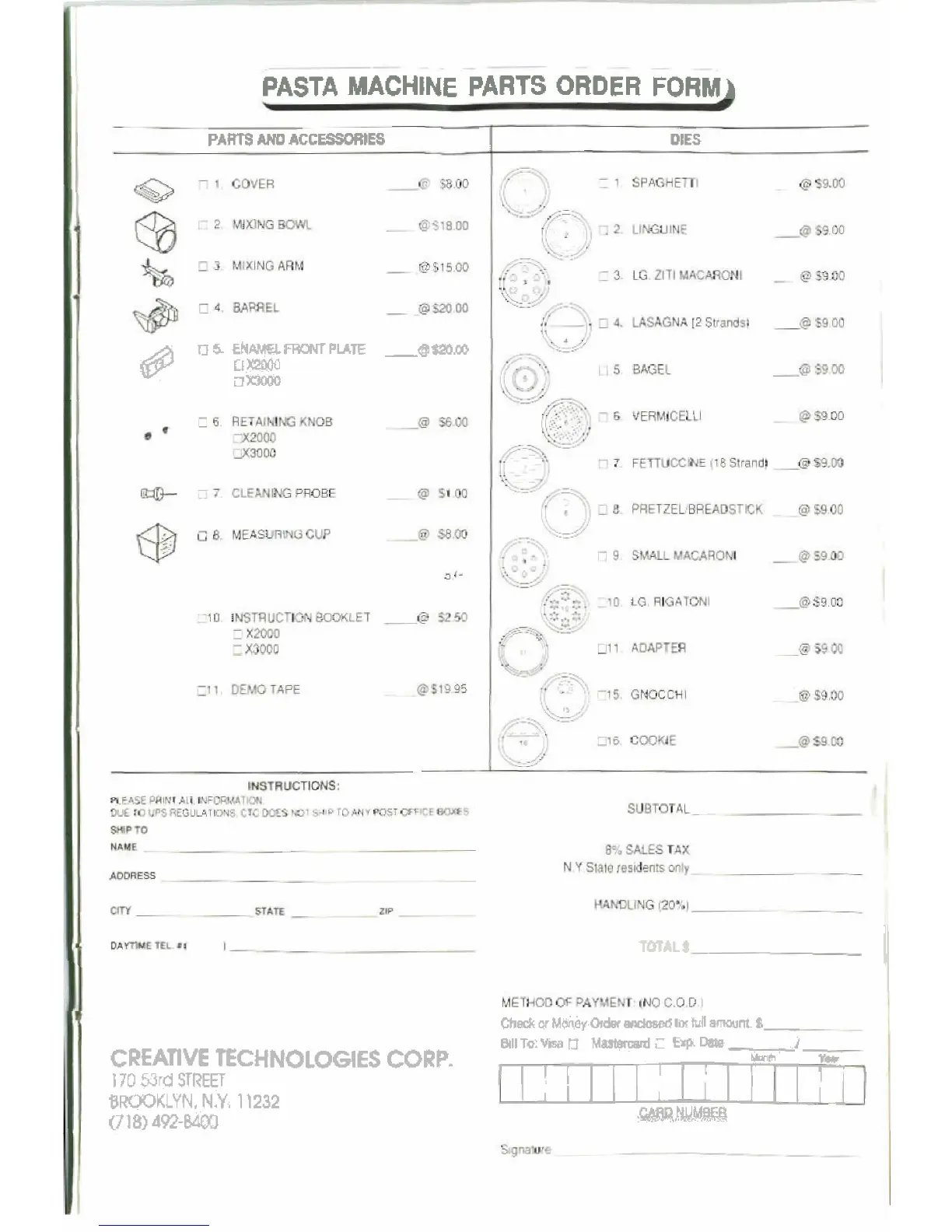 Creative Technologies Pasta Express X2000 - Pasta Machine Parts Order Form