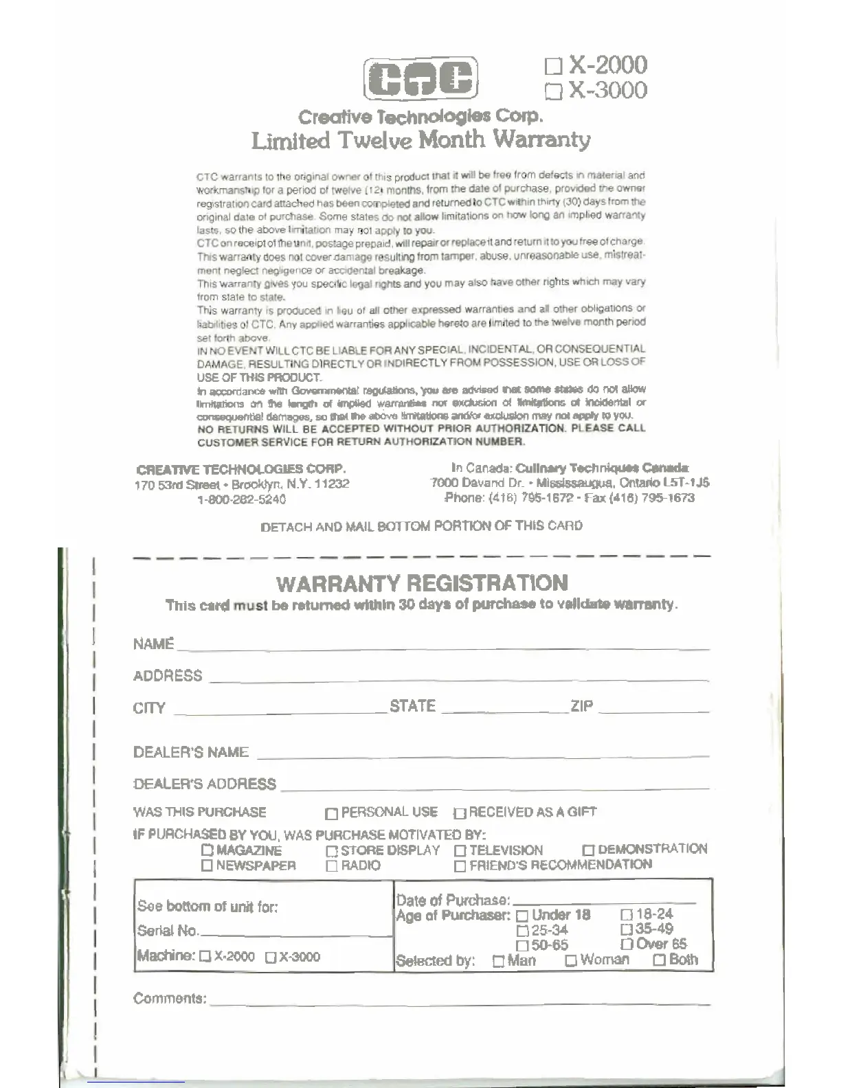 Creative Technologies Pasta Express X3000 - Warranty