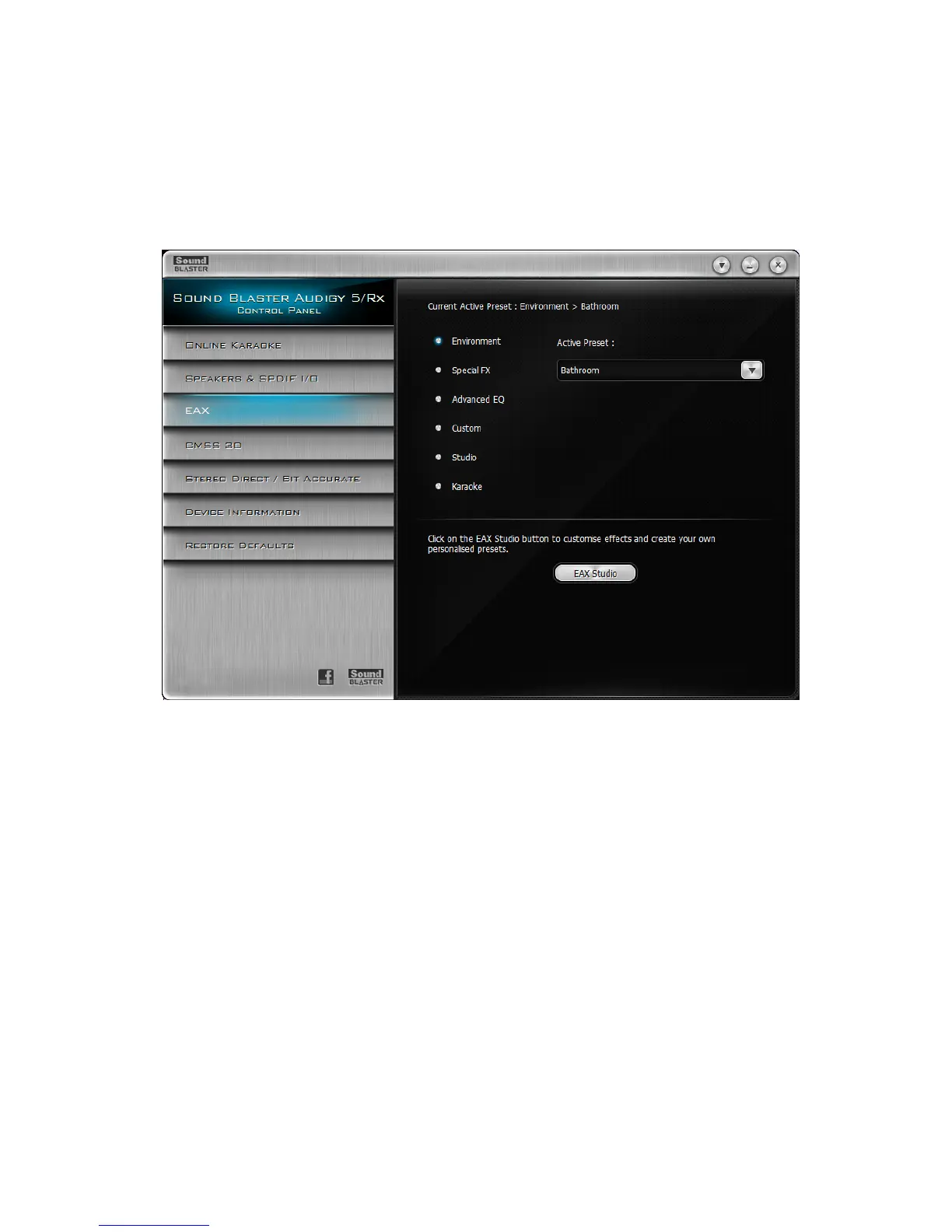 4. Click the EAX Studio button to launch Sound Blaster Audigy 5/Rx EAX Studio and consequently cus-