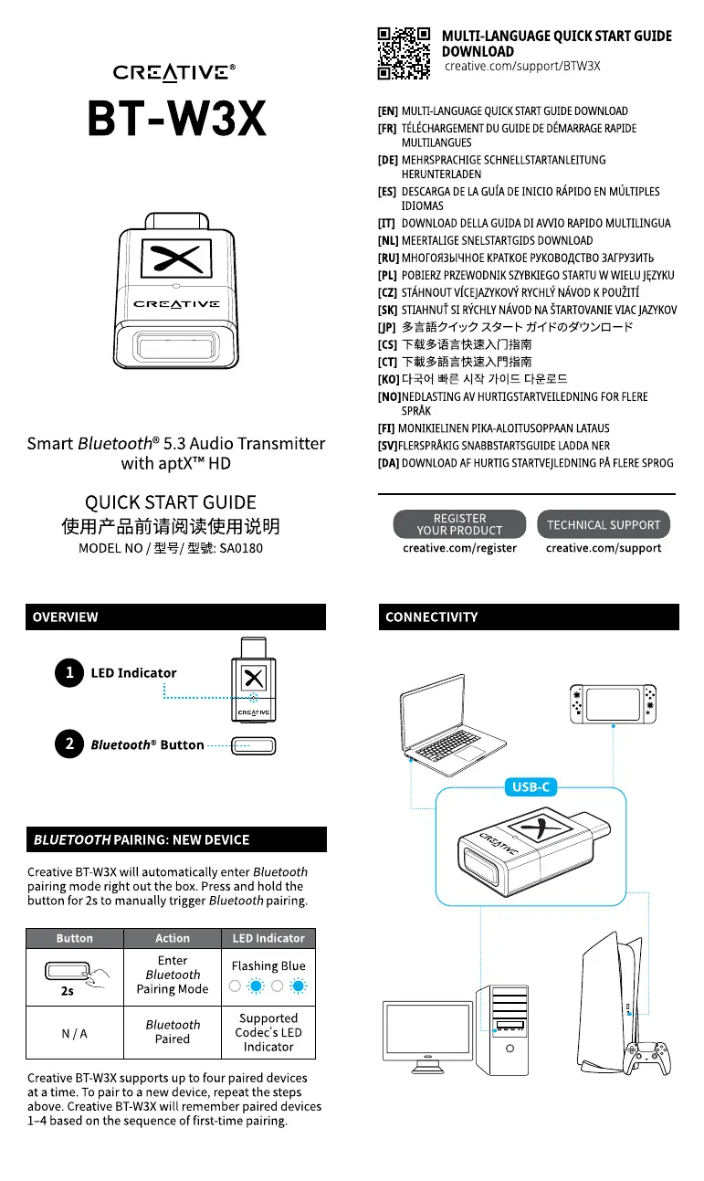 Creative BT-W3X - Overview; LED Indicator; Bluetooth Button; Bluetooth Pairing: New Device