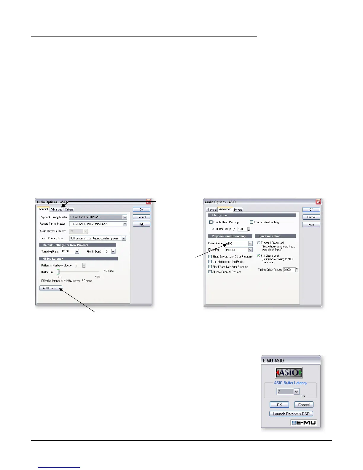 3. Set the Audio Settings as shown in the dialog boxes above. Select E-MU ASIO.