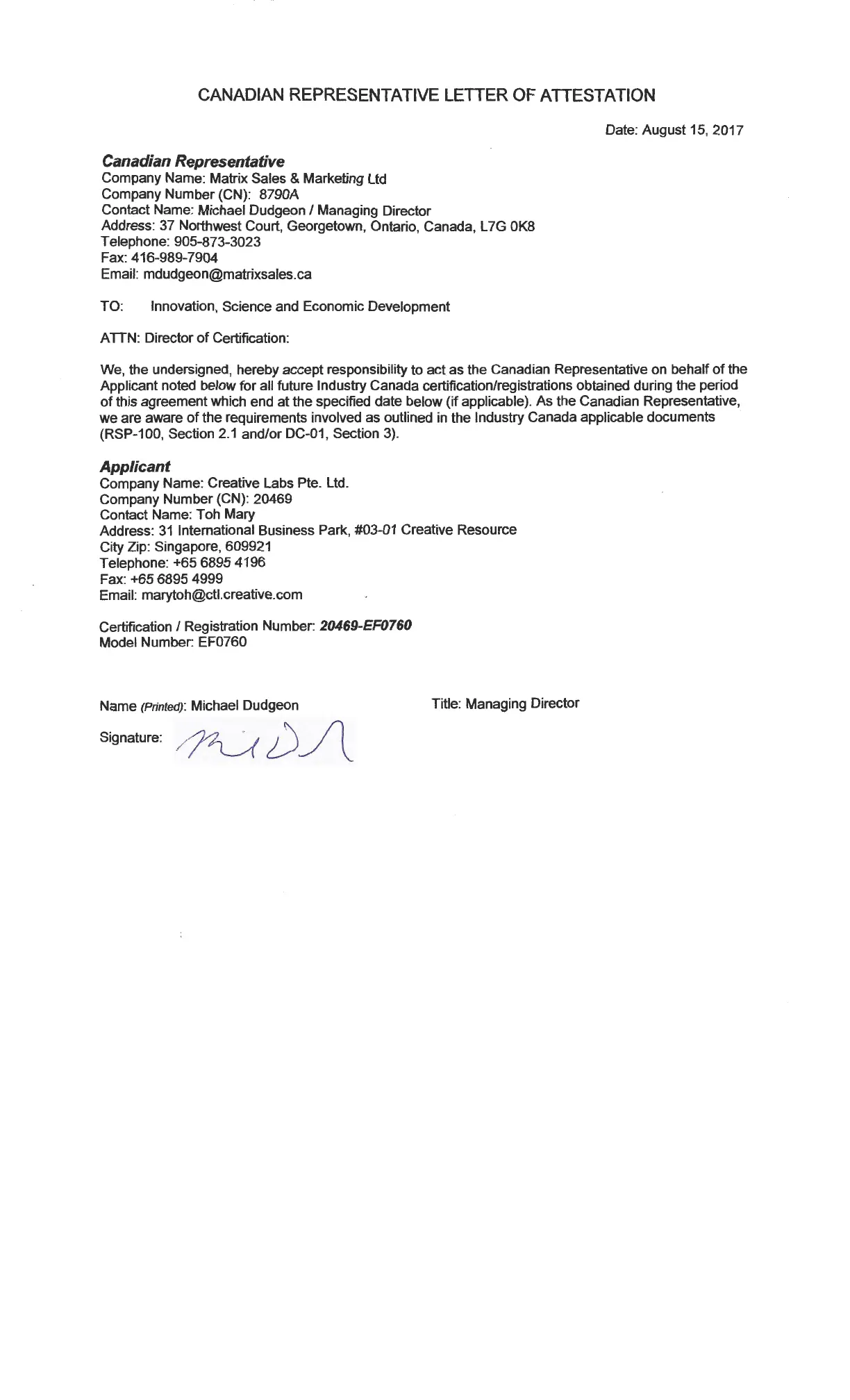 We, the undersigned, hereby accept responsibility to act as the Canadian Representative on behalf