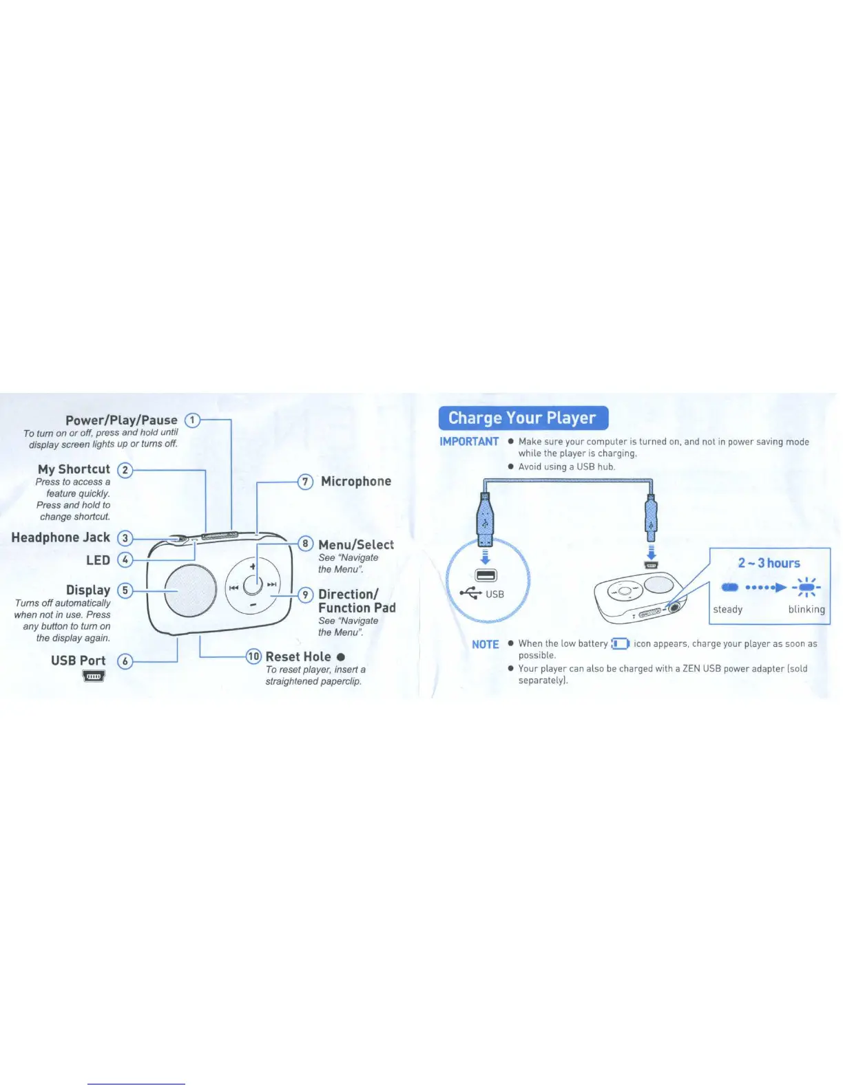 Creative Zen Stone plus - Player Controls and Charging; Device Layout Identification; Player Charging Procedure