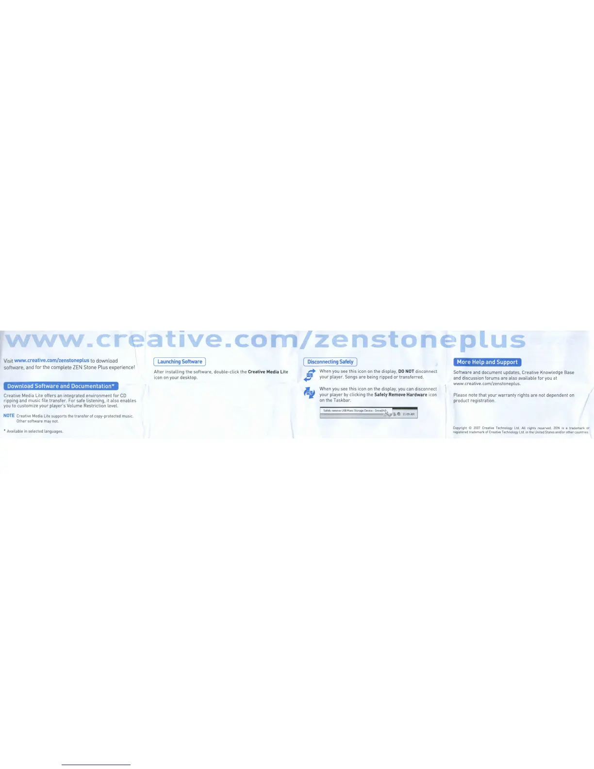 Creative Zen Stone plus - Software, Updates, and Support; Software Download and Installation; Safe Disconnection Procedures; Accessing Additional Support